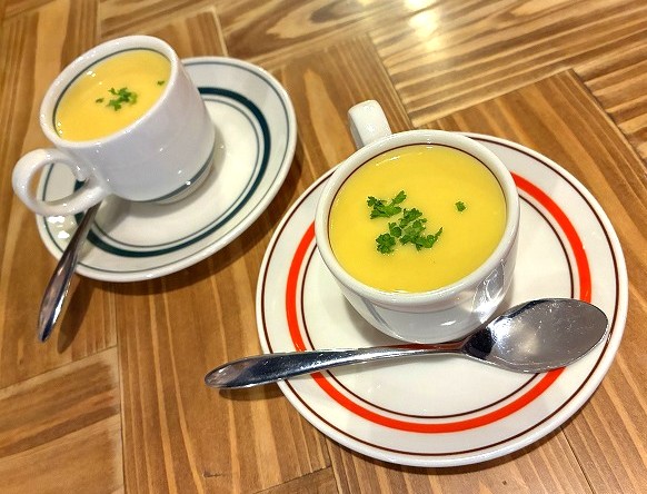 まずはコーンスープが来たよ~~~🌽 飲んでいたら、すぐハンバーガーが来たよ~~~🎵