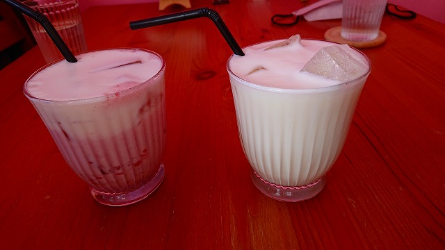 左は自家製いちごミルク、右が自家製アイスジンジャーミルク