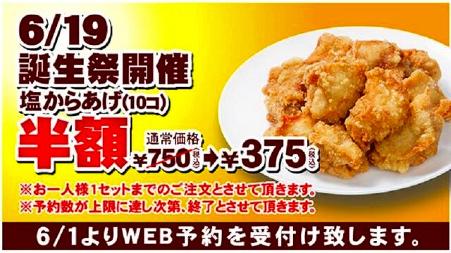 毎年、6/19は大分からあげの誕生祭で、塩からあげ10個半額🍗になるよ
