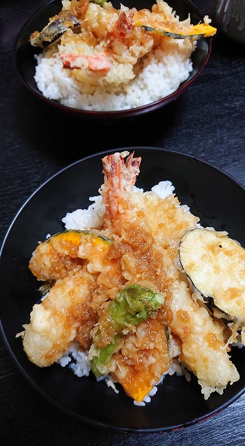 海老が2つ乗っかってて、茄子と玉ねぎとししとうとカボチャ、大満足だよね💛