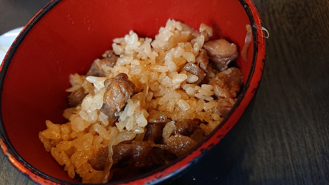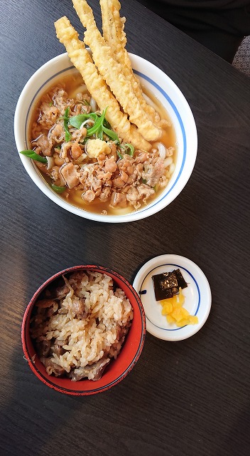 主人は肉ごぼううどんと、かしわご飯