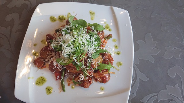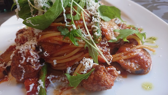自家製ポルペッティ、茄子、パプリカ、ベビーリーフとリコッタチーズトマトソース🍝