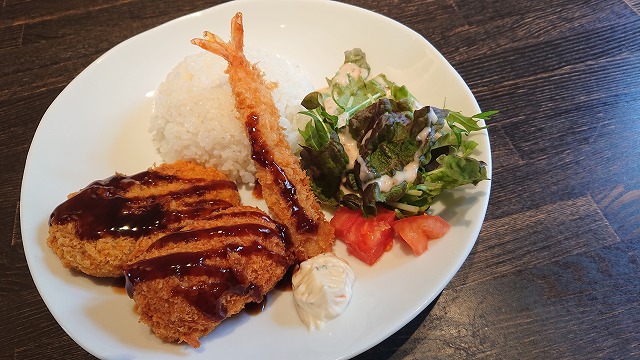 平日おまかせプレートのコロッケプレート こっちもエビフライついてる🦐