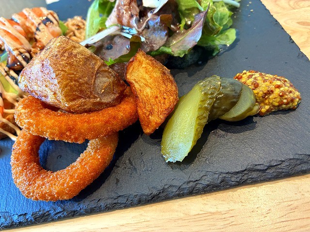 カリッカリのオニオンフライとポテトフライ、ピクルスもあったよ✨