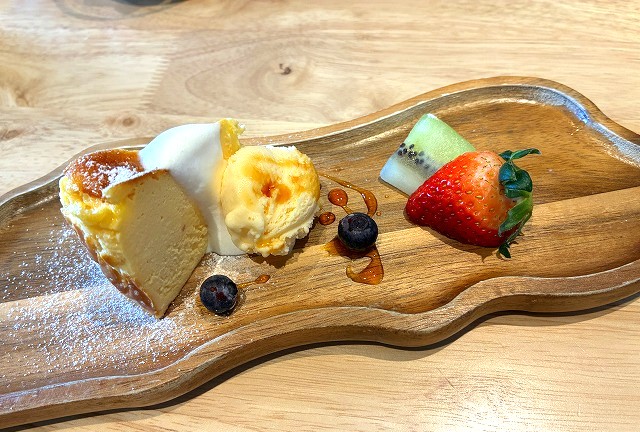 バスクチーズケーキとバニラアイスとフルーツさん🍓🥝🍇