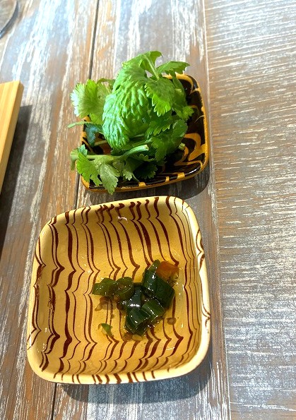 お好みでどうぞ、と パクチーと青唐辛子のオイル どちらも(・∀・)イイネ!!