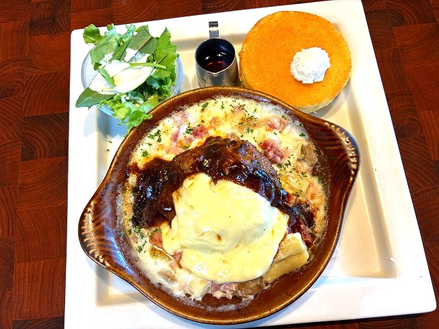 okarieは、とろーりチーズのハンバーググラタン&パンケーキプレート🥞