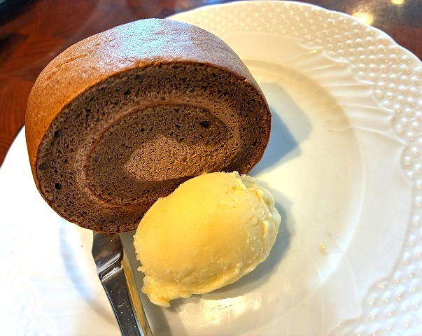 そして、ケーキも食べたいという    チョコレートロールケーキ バニラアイス添え