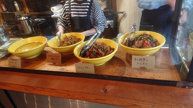 この中の3つが選べるよ(^^♪ カイダーオ、スパイスとハーブの鶏ミンチ、色々野菜のタルカリにしたよ💛