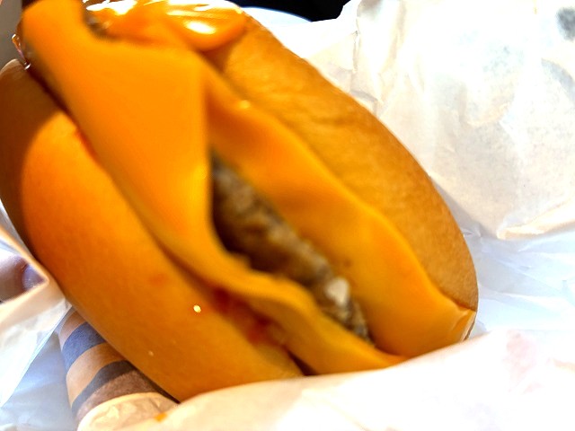 娘はダブルチーズバーガー好きで、チーズがたっぷりだと、見せてくれたよ! ※ピンボケですが