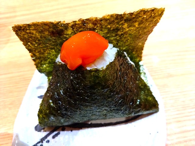 県産特選のお米を使用している萬吉のおむすびは、卵黄醤油漬けにしました🥚