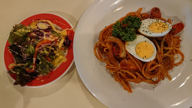 こちら、昭和ナポリタン、サラダ付き🎵 okarieは単品❔❔ チキン南蛮昭和ナポリタン