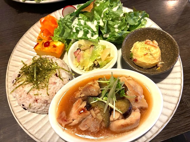 サラダ、キッシュ、ポテサラ、小鉢も付いて、雑穀米と、メインは……塩だれチキン🎵