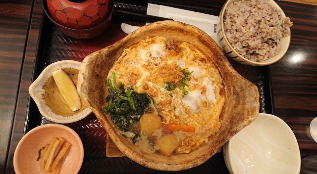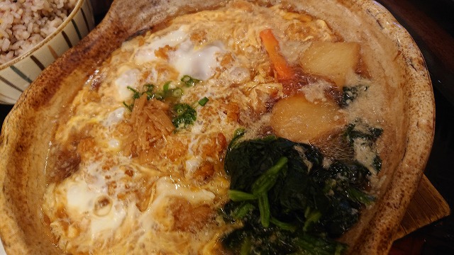 かあさんの玉子とじ定食、ご飯は五穀米で大盛にしましたよ