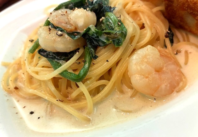 エビとホウレン草のクリームソースパスタ🦐 おかわりOKの自家製フォカッチャ付き