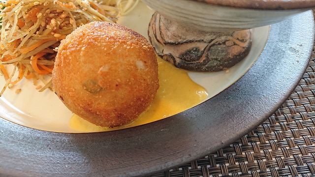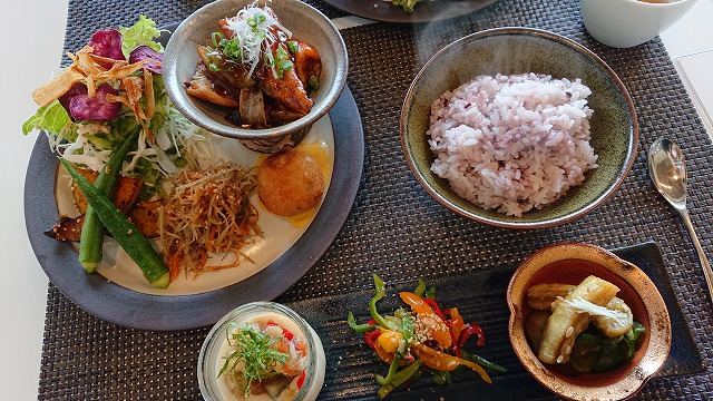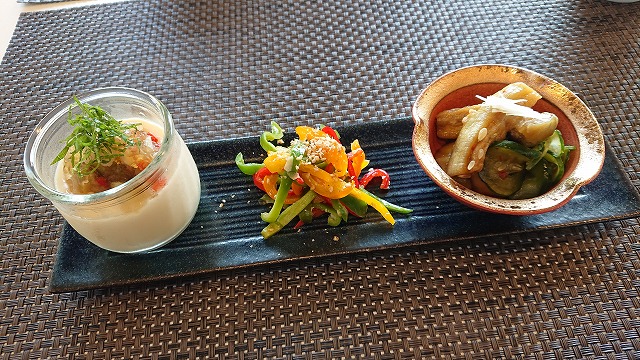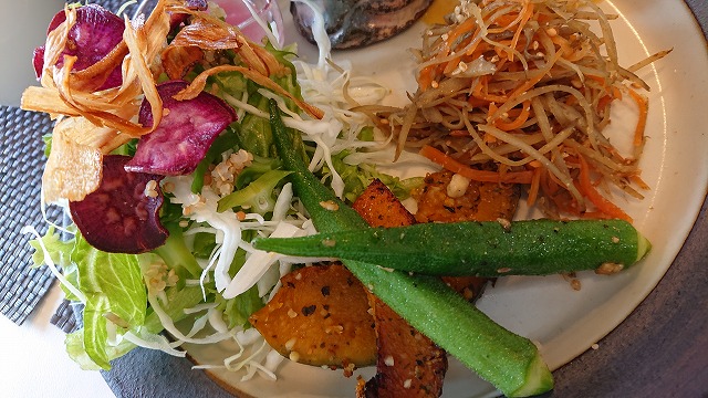 季節のサラダ(紫玉ねぎドレッシング) かぼちゃのハーブ&チーズグリル ごぼうのきんぴら