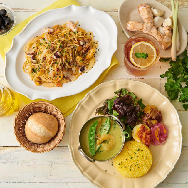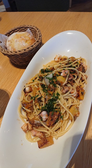 OさんもSさんも、タコとイエローズッキーニのオリーブソースパスタ パン、紅茶付き