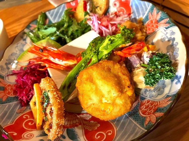 れんこんフライ、おとし揚げ、春菊のサラダ、エビのマヨチーズ焼、レンズ豆のソテー、