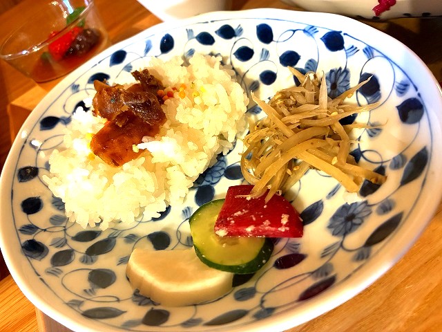 ごはん、きんぴらごぼう、佃煮、塩麴浅漬け(だいこん、きゅうり、たくあん)