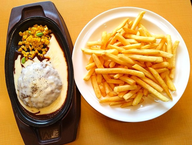 チーズONチーズINハンバーグ 山盛りポテトフライ🍟(小さいのなかったのか)