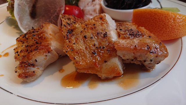 今日はチキンソテーだよ🍗   ひじきとサラダとフルーツまで乗っかっていたよ🍊🥝