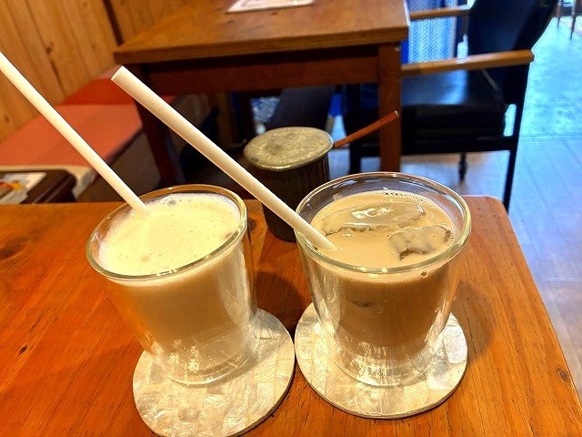 ドリンクキマシタ~~~✨ 左がラッシー 右がチャイ めっちゃ旨!(大きいサイズにすればよかった…💧)