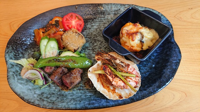 ステーキ肉もあるし、チキンのトマト煮、海老やホタテ、カボチャのグラタン、茄子のフライ…