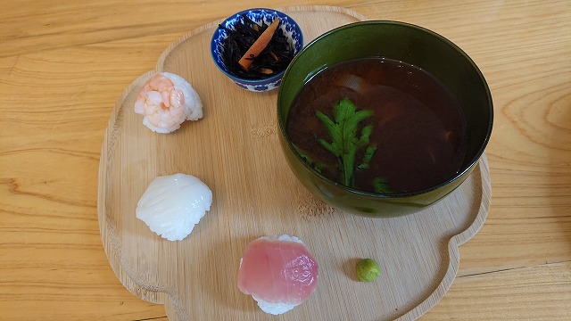 手毬寿司かわいい、ひじきもあるよ🎵 赤だしのおみそ汁は、見えてないけど、具だくさん(笑)