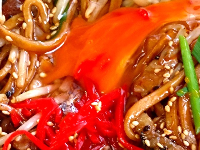 お友だちは、ソース焼きそばで生卵をトッピング✨