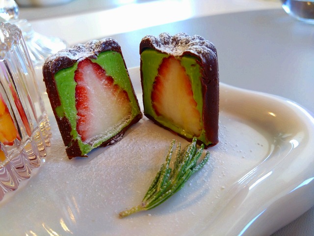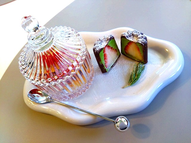 Mちゃんとokarieは、抹茶のガナッシュにイチゴが入ったカヌレ型のチョコです!