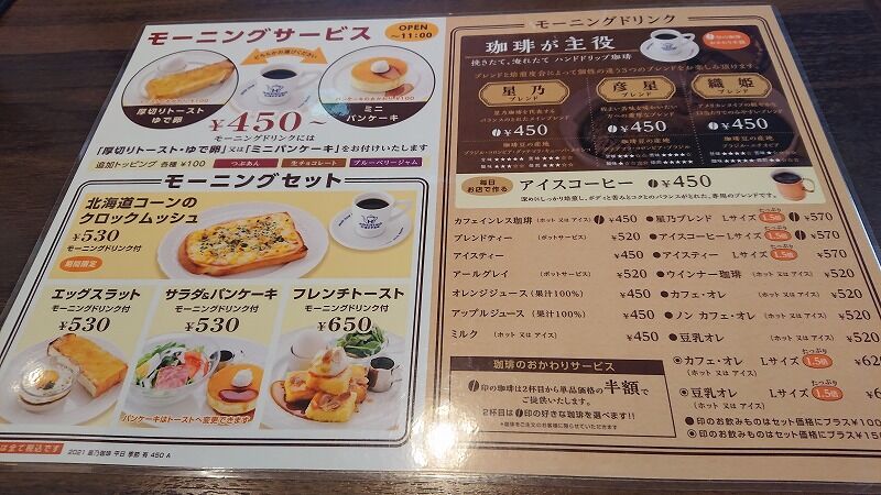 つかのまのモーニング『星乃珈琲店』 2021 8/25 朝早く、買い物ついでにモーニングです 星乃珈琲でモーニング☕ こういうのも気になる かき氷もあるのねん? 今日は、ウィンナコーヒー☕ あわあわほわほわ うーーーむ、旨し☕ 北海道コーンのクロックムッシュ? おいしい、おうちでも、やってみたい Cafe@oita よかったらシェアしてね! URLをコピーしました! URLをコピーしました! コメント コメントする コメントをキャンセルコメント ※ 名前 ※ メール ※ サイト 次回のコメントで使用するためブラウザーに自分の名前、メールアドレス、サイトを保存する。 上に表示された文字を入力してください。 Δ