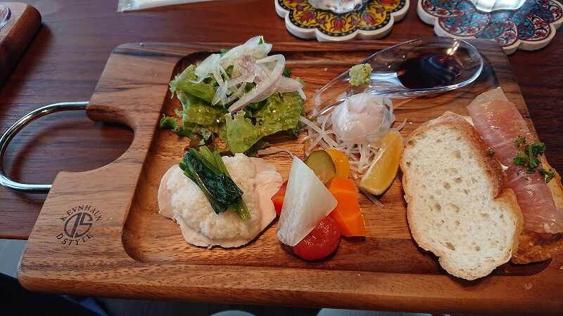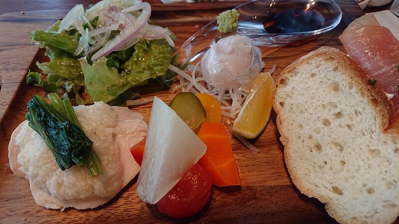 チキンのとろろかけとかピクルス、生ハムとクリームチーズのバゲット、サラダ