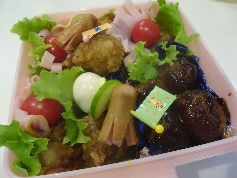 からあげ、チーズハンバーグ、ウインナー、ウズラの卵、ハムとトマト、、、、