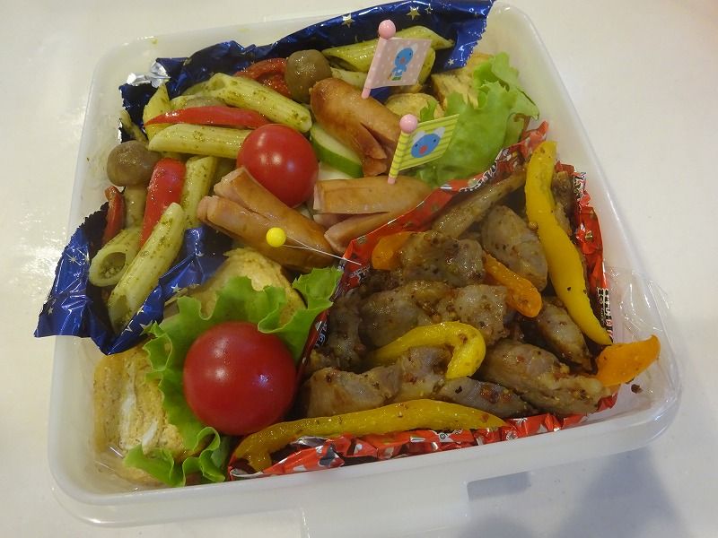 ペンネのバジル、パプリカのポークソテー、明太子の卵焼き
