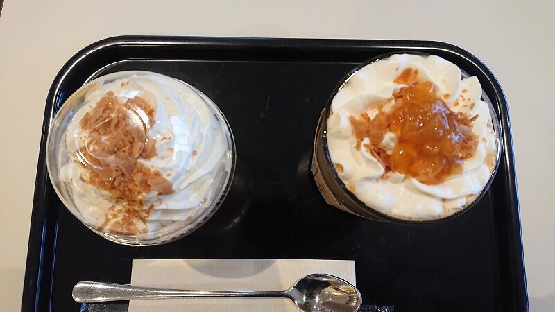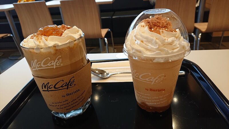 左がNちゃんのアップルパイホットラテ、右がokarieのアップルパイフラッペ![]()