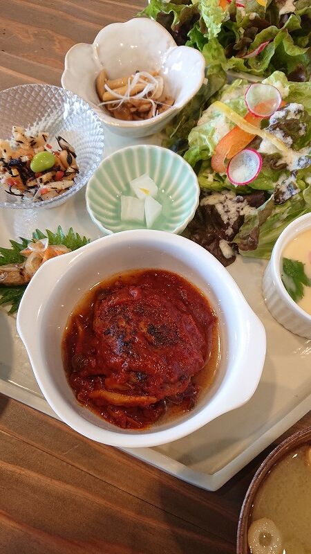 okarieのメインはトマト酢入りの煮込みハンバーグ![]()