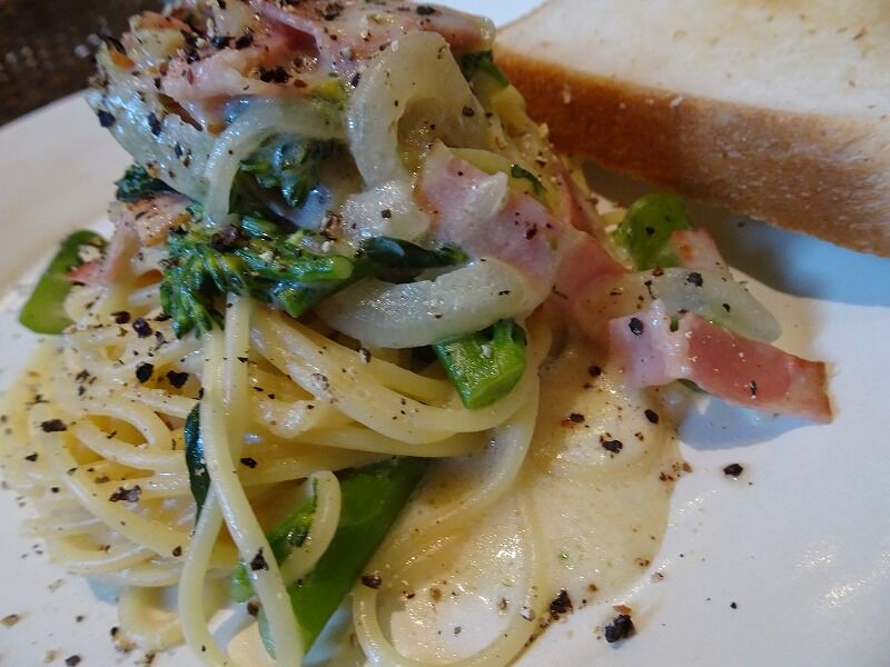 okarieは、ベーコンとスティックセニョールの豆乳クリームパスタ![]()