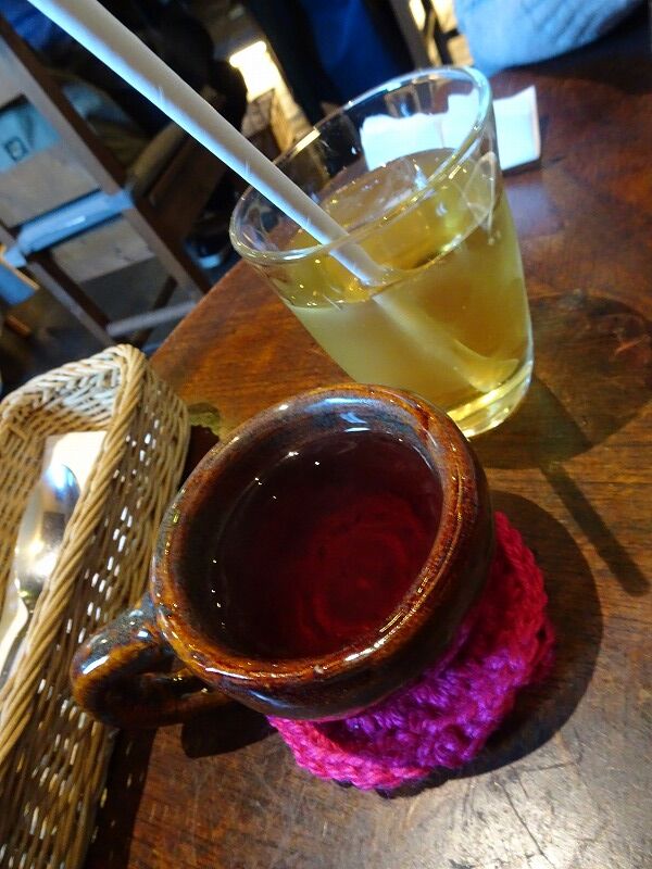 ドリンクもついてるよ、リンゴジュースとハーブティ、ちょっと珍しいビジュアルかも。