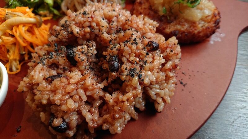 大豆ミートの唐揚げ、ベジハンバーグ玉ねぎソース、破竹の煮物、季節野菜のオーブン焼き、
