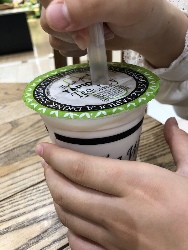 お店の方がストローを刺そうとして、自分がやりたいって、やってました(笑)