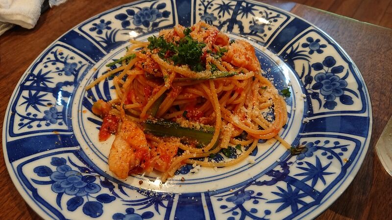 メインのパスタは、ブリとバジル小松菜のトマトスパゲティ?