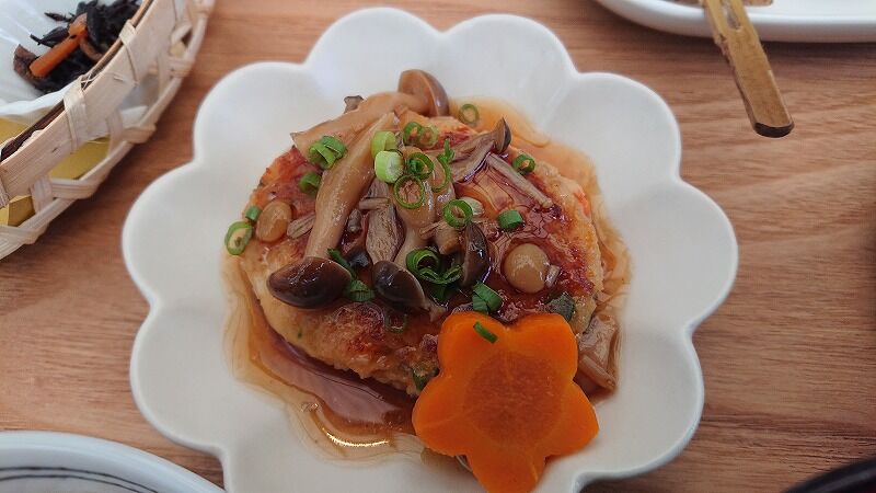 メインはこれかな、大豆ミートの豆腐ハンバーグきのこあんかけ
