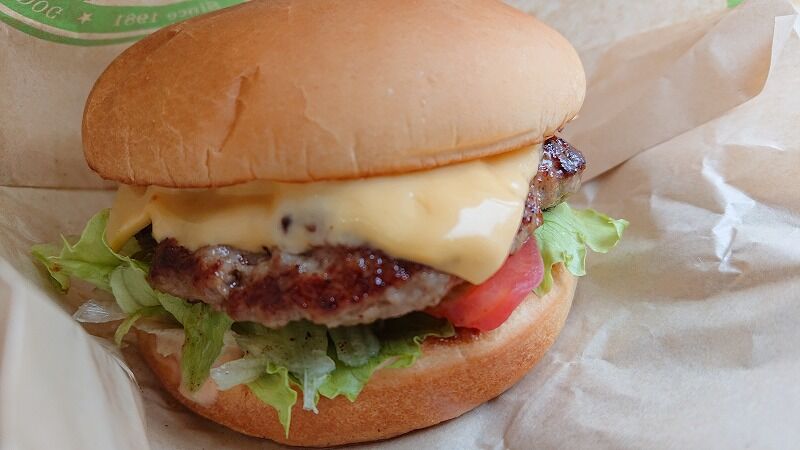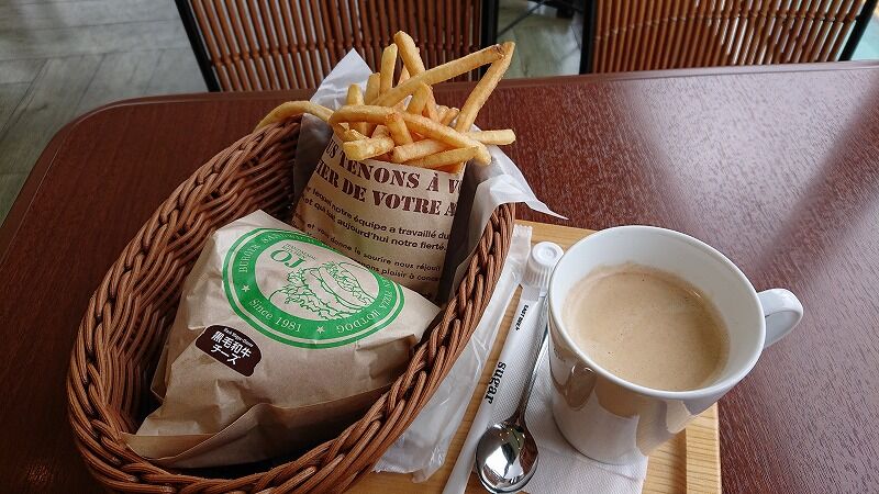 黒毛和牛のお肉を使ったチーズハンバーガー?と濃い味のポテト、ホットコーヒー☕