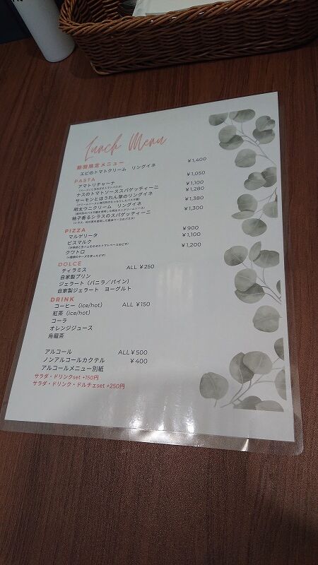 パスタを2つ選んで、サラダ、ドリンク、ドルチェのセットにしました