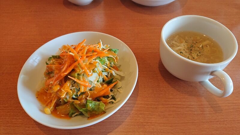 最初にサラダとスープがやってきたよ