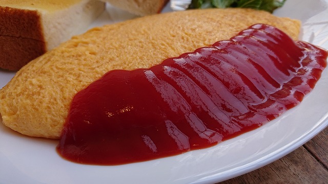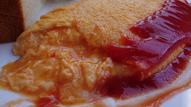 チーズオムレツです、とろとろ (ケチャップ多いな)