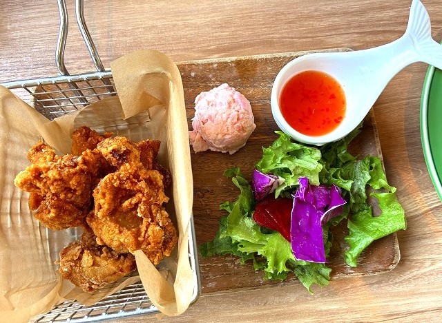 娘はモチコフライドチキン食べたいって! お隣のベーコンも食べたいらしい!