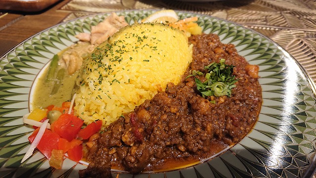 『肉屋のスパイスカレー あいのりキーマン』ハーフ&ハーフのカレーとラッシー